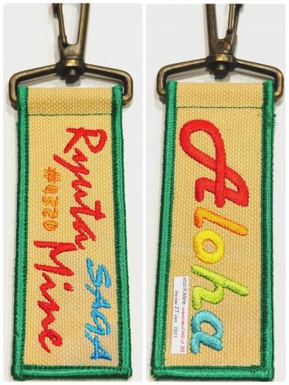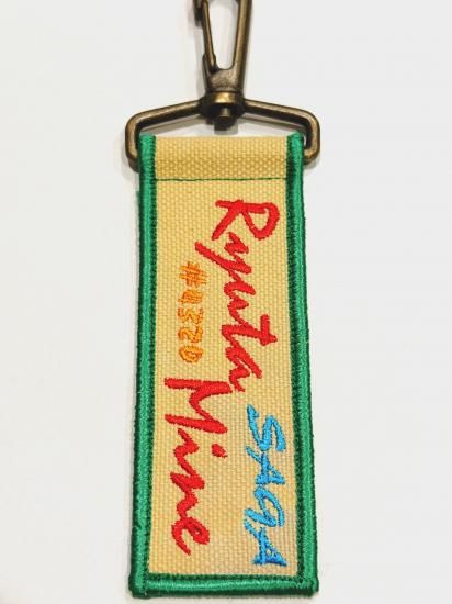 本人使用済みの防護具(ケブラーズボン)をリサイクルし、千社札をモチーフにしたキーホルダーです。裏面は選手それぞれのデザインになっています。使用期間も明記してあります。