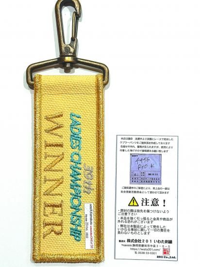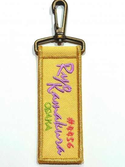 本人使用済みの防護具(ケブラーズボン)をリサイクルし、千社札をモチーフにしたキーホルダーです。裏面は選手それぞれのデザインになっています。使用期間も明記してあります。